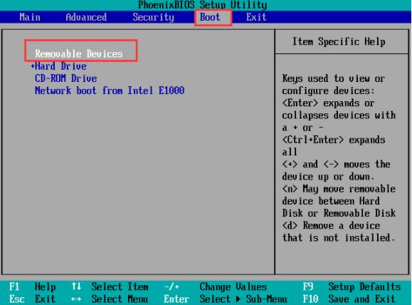 3、使用“+”鍵調整選項“Removable Devices”至第一的位置,然后按“F10”在彈出來的彈框中選擇“YES”保存退出即可