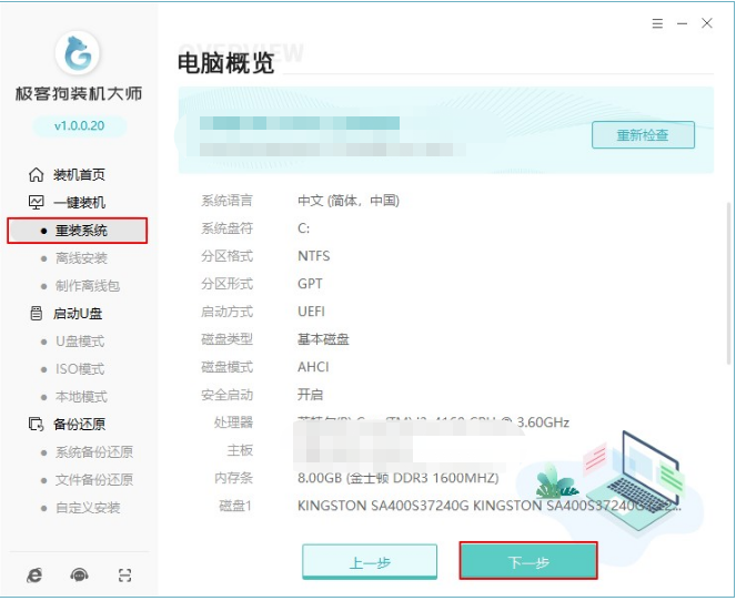 1、下載安裝極客狗裝機大師官網并打開軟件,選擇“重裝系統”進入其中,等待檢測完電腦配置信息之后,鼠標點擊“下一步”。