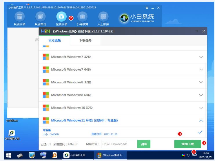 5、分區成功之后,點擊打開桌面的小白裝機工具,點擊在線安裝,根據我么你自己的需求選擇windows鏡像文件,選定之后點擊添加下載。