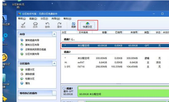 5、‘進入到pe之后,要在uefi下安裝win10系統,硬盤需要GPT分區表,雙擊桌面上的【分區助手(無損)】,選擇磁盤1,點擊【快速分區】,如果你是多個硬盤,要選對,根據固態硬盤大小選擇,不要誤刪。