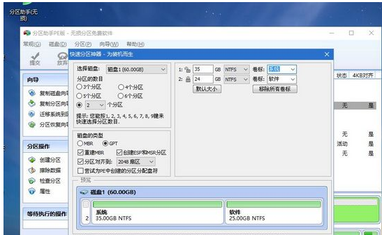 6、設置分區數目、分區大小以及分區類型,卷標為【系統】的系統盤建議60G以上,由于選擇了UEFI啟動,磁盤類型要選擇GPT,【分區對齊到】是4k對齊,2048扇區就行,也可以4096扇區,確認無誤后點擊開始執行。