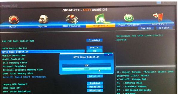 2、在電腦上插入U盤,為了發揮固態盤的速度,首先要進BIOS開啟硬盤AHCI模式,通常新型電腦默認就是ahci,不需要改,這一步一般可以省略。以技嘉主板為例子,啟動電腦時按Del進入BIOS界面。切換到Peripherals界面,選擇SATA Mode Selection回車,選擇AHCI回車,按F10保存重啟。