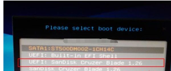 3、重啟后不停按F12或F11或Esc等啟動快捷鍵,調出啟動菜單對話框。選擇識別到的U盤選項,一般是U盤名稱或者帶有USB字樣的,比如SanDisk,如果要uefi模式下安裝,選擇帶UEFI模式的項,按回車鍵進入。