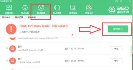 2.驅動備份:點擊工具欄的”開始備份“,我們可以勾選需要備份的驅動程序,點擊”開始備份“。