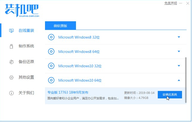 2、我們進入裝機吧在線重裝界面,就可以選擇需要的操作系統進行安裝,我們現在的電腦基本上都可以兼容win10系統。但是有的電腦不會兼容win7系統,所以我們有些想選擇win7系統的小伙伴可能會發現win7系統下方的安裝此系統按鈕為灰色,建議大家還是選擇win10系統進行安裝哦。