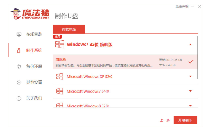 1、下載安裝并打開魔法豬裝機工具,插入U盤,進入軟件主頁界面,選擇u盤重裝系統,點擊開始制作。
