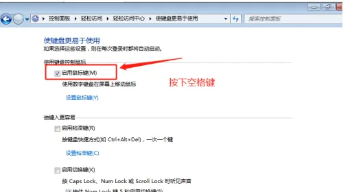 4、通過方向鍵移動光標到【啟用鼠標鍵】--按下【空格鍵】勾上復選框。