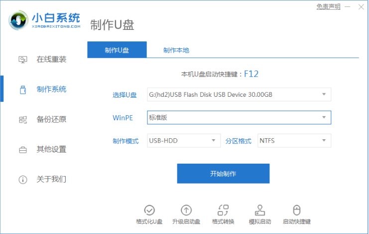 1、我們先在可用的電腦上安裝小白一鍵重裝系統工具,插入空白u盤到電腦,點擊打開選擇制作系統模式,鼠標點擊開始制作。
