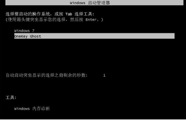 5、這時候電腦會重啟操作,重啟進入開機啟動項頁面時多出Onekey Ghost選項,系統會默認自動選擇Onekey Ghost進入安裝過程當中。