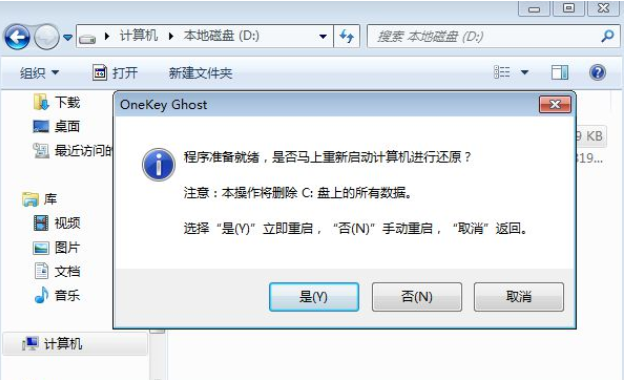 4、彈出提示框,確認沒有重要數據之后,點擊是,立即重啟進行計算機還原,也就是安裝雨林木風系統過程。