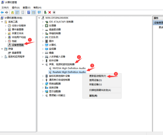 2、在設備管理器界面中,鼠標雙擊打開聲音設備,在所列的硬件中鼠標右鍵點擊,選擇“更新驅動程序”。