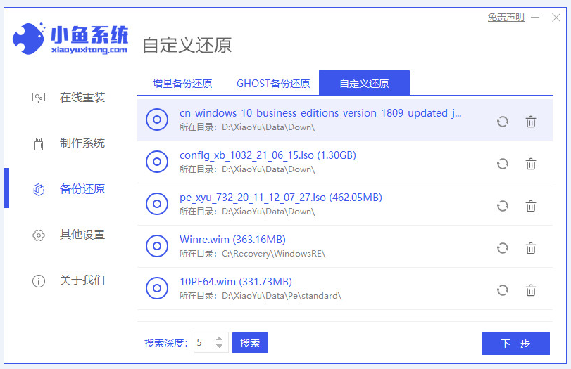 2、如圖所示,在備份還原界面中點擊右側“自定義還原”,選擇需要安裝的win10系統鏡像,再點擊“下一步”。