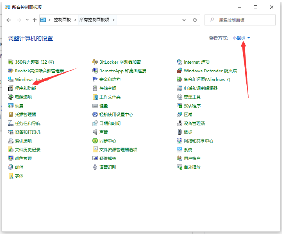 2、將查看方式切換成小圖標,然后找到并點擊程序與功能。