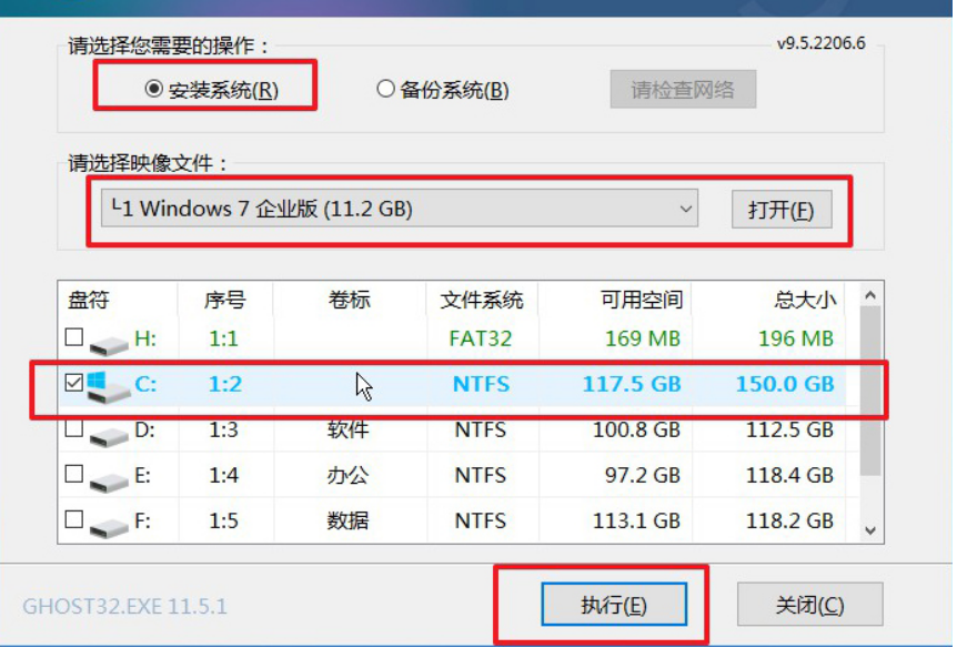 4.打開老毛桃一鍵裝機,選擇u盤里面的Windows7系統鏡像,安裝在“C盤”,點擊“執行”。