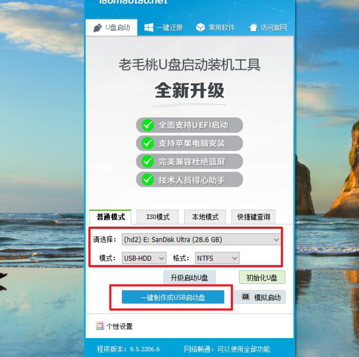 1.將空白u盤接入可以正常使用的電腦,關閉安全殺毒軟件,打開老毛桃u盤啟動盤制作工具,默認設置,制作一個u盤啟動盤備用即可。