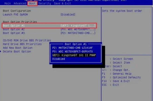 6、進入界面之后,在Boot里選擇Boot Option #1,再選擇UEFI:KingstonDT 101 II PMAP。