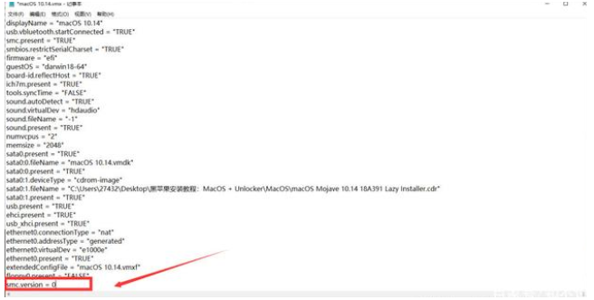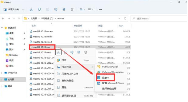 6.在系統中找到MacOS的安裝位置,鼠標右鍵點擊使用【記事本】打開【macOS 10.15.vmx】系統文件。