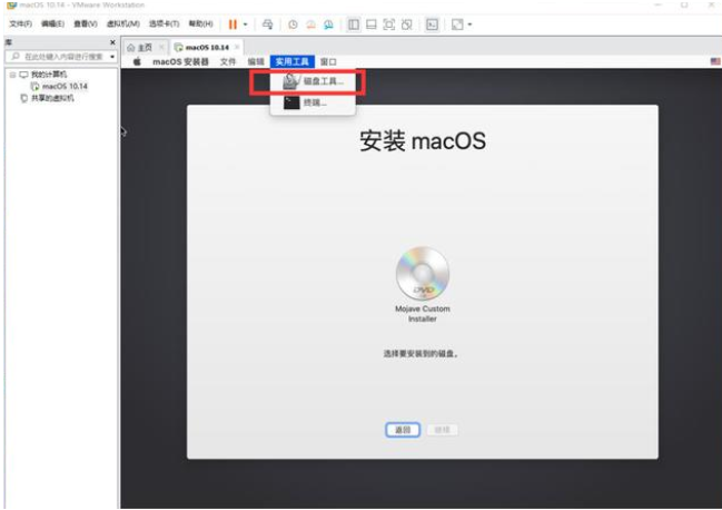 9.進入安裝頁面,發現無法正常安裝,是因為沒有磁盤。點擊頂部【實用工具】,選擇【磁盤工具】功能即可。