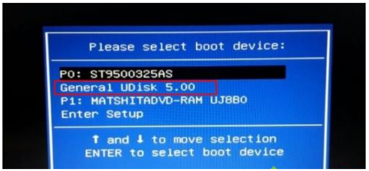 2、在我們的電腦上插入U盤,重啟過程中按Esc調出啟動菜單,就選擇識別到的U盤名稱,再按回車鍵。