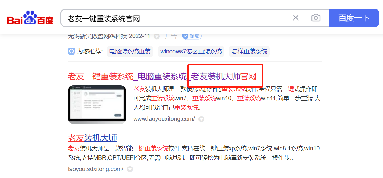 1、如何找到老友一鍵重裝系統官網呢?首先打開電腦瀏覽器,百度搜索老友一鍵重裝系統官網,看到有帶官網字樣的,就是了。