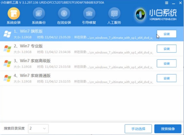 9、進入到系統后,小白一鍵重裝系統軟件就會自動打開搜索系統鏡像,找到鏡像后,點擊【安裝】,此時無需更改準備安裝界面,單擊【開始安裝】,然后選擇繼續,等待系統安裝成功即可。