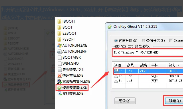 3、點開解壓后的文件夾(Windows 7 X64),雙擊打開【硬盤安裝】程序,組裝程序將自行識別該文件夾中準備的win7系統,能夠參照下圖選擇磁盤安裝分區,隨后點一下【確定】。
