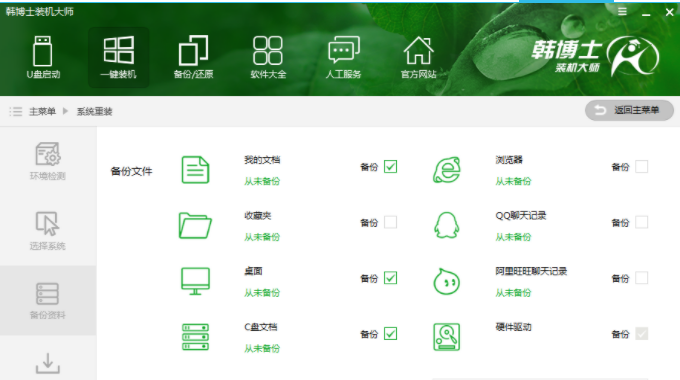 1、打開韓大師一鍵重裝系統,選擇重裝系統后,會進行環境檢測。韓博士裝機大師會顯示當前電腦的配置,并根據檢測結果,選擇推薦的系統。