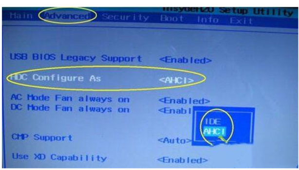 2、進入 bios之后,通過鍵盤方向鍵選中“Advanced”,再選中“HDC Configure As”,按回車鍵。