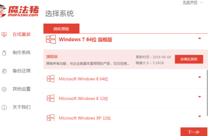 1、先下載好魔法豬軟件,關閉殺毒軟件,,進入軟件后選擇在線重裝,點擊我們想要的win7系統進行安裝。
