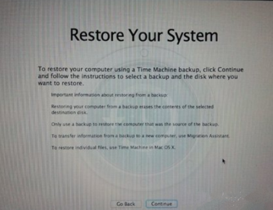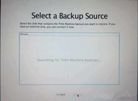 5.如果點擊 Restore From Time Machine Backup,此時要將過去用作 Time Machine 備份的外置硬盤與 MacBook Air連接后 ,再點按Continue。