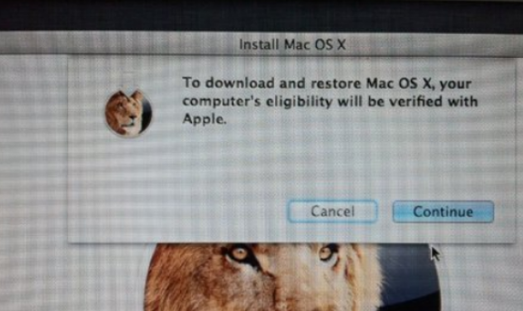 9.點擊Reinstall Mac OS X,然后會彈出在安裝前會先與 Apple 的伺服器取得認證,這個時候一定要連接互聯網,然后點擊Continue繼續。