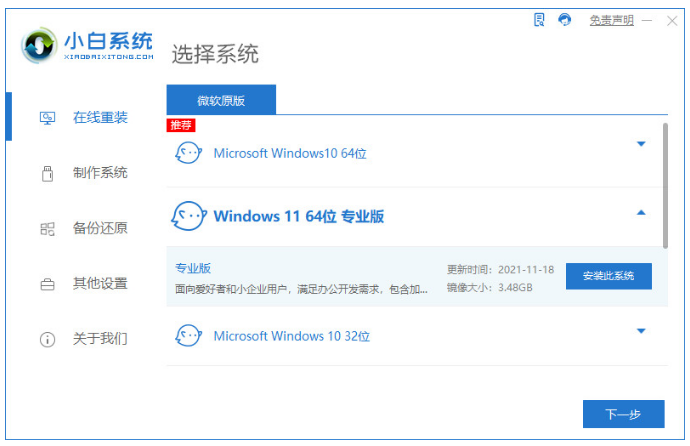 1.首先下載安裝好并打開小白一鍵重裝系統,在界面上選擇win11系統。點擊安裝此系統,點擊下一步。