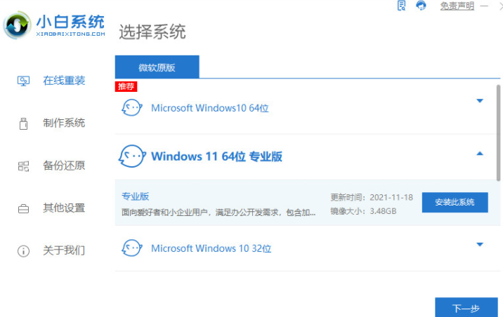 1、首先要在電腦上下載安裝好小白一鍵重裝系統工具并打開,在線重裝界面選擇win11系統。