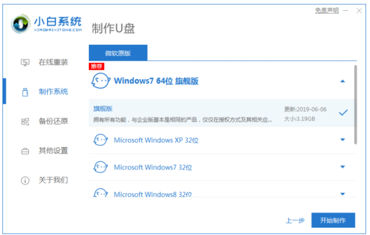 插入U盤,打開小白一鍵裝機,點擊制作系統,再點擊開始制作。