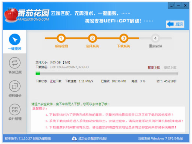 3、點擊完成系統后,番茄花園就會自動下載對應系統進行下載。下載完成后,電腦會自動重啟。