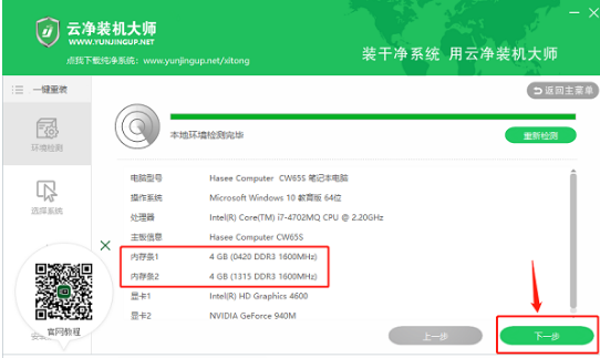 1.系統檢測,下載軟件完軟件后正常打開("云凈裝機大師"), 程序會默認檢測當前系統環境,檢測完成后,點擊"下一步"。