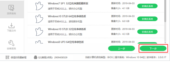 2.選擇系統,極速裝機大師已為您推薦適合電腦配置的系統版本,用戶也 可選擇XP,Win7,Win8或Win10,點擊"下一步"。