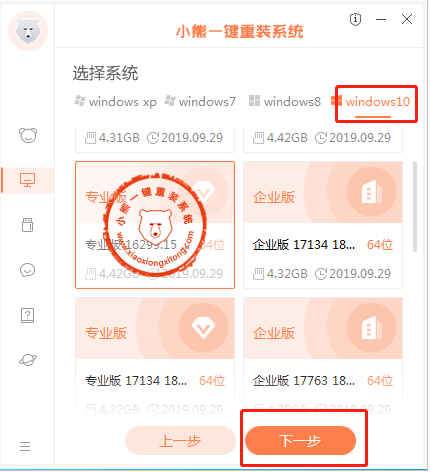 第二步,等小熊檢測完系統信息后,開始在windows10欄目中選擇合適的系統文件進行下載安裝。