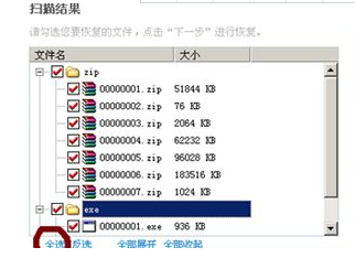 5、幾分鐘不到,掃描結果出來了。點擊全選就可以恢復所有重裝系統丟失的文件,再點下一步即可?!?/p>