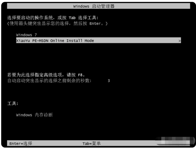 4、重啟后,我們會進入這個界面,選擇帶PE的系統(10秒后也會自動進入)。