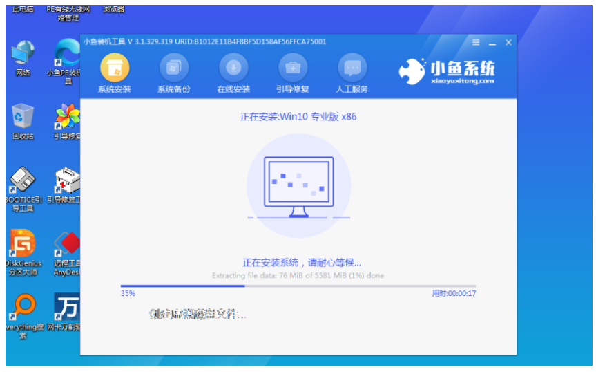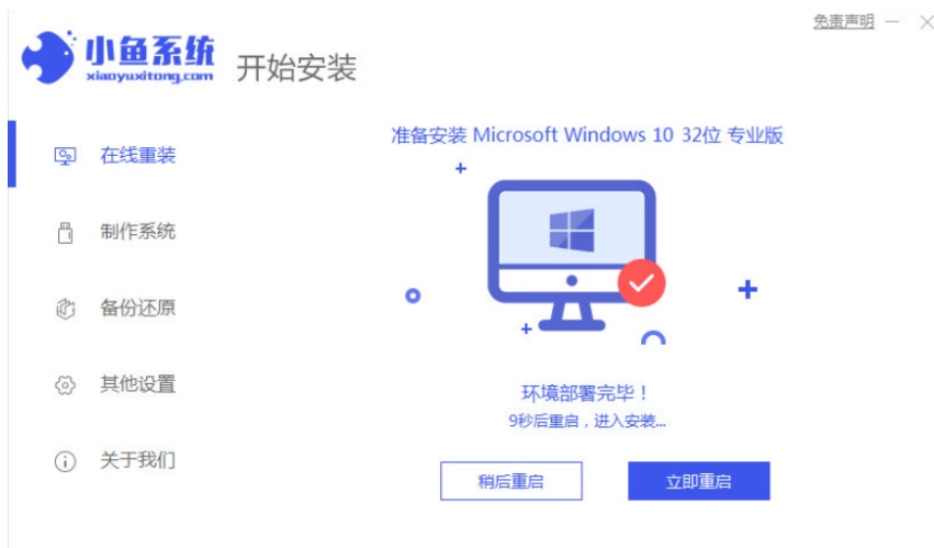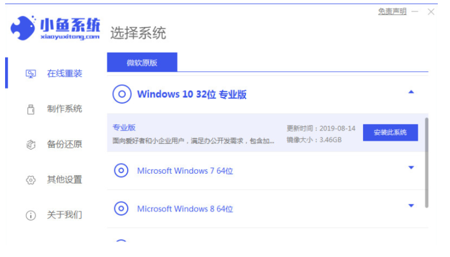1、從官網下載小魚一鍵重裝軟件到電腦上,運行程序,點擊在線重裝項目欄,選擇需要安裝的win10 32位系統,單擊下一步。
