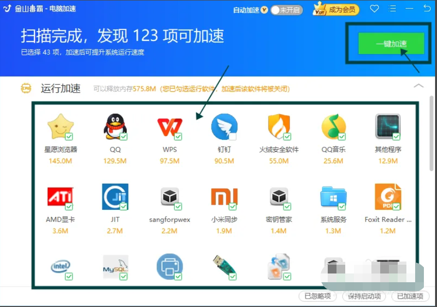 2、等待系統掃描完成,發現可加速項,勾選加速列表中的加速項,然后點擊【一鍵加速】。