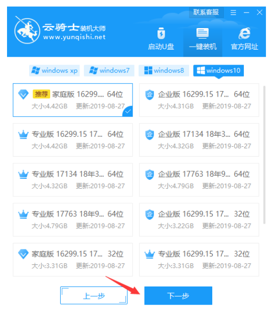 2、接著云騎士裝機軟件自動推薦適合你電腦的操作系統,以Win10系統為例。選擇合適的版本,然后單擊【下一步】。