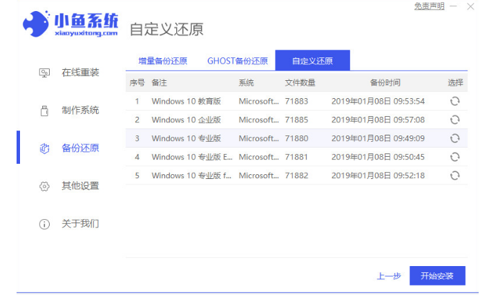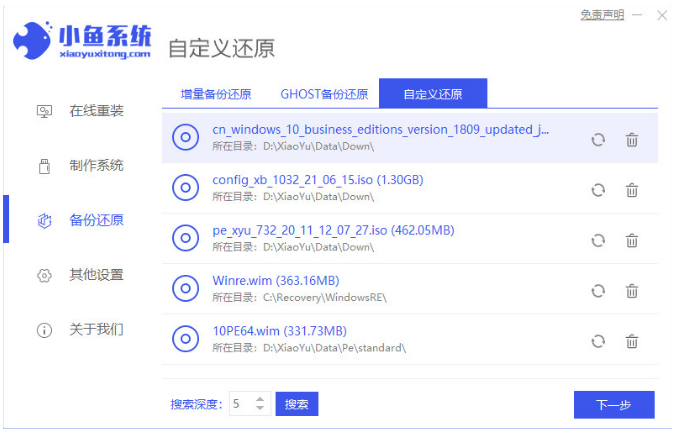 2、在備份還原界面選擇“自定義還原”,接著選擇我們需要安裝的win10系統鏡像進入下一步。