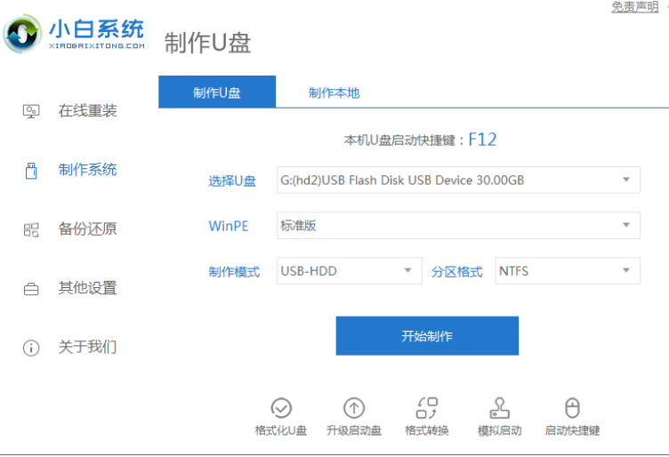 1、首先準備個 4GB 以上的 U 盤,用其它電腦百度搜索小白系統,在制作系統中,選擇制作 U 盤,直接默認制作即可。
