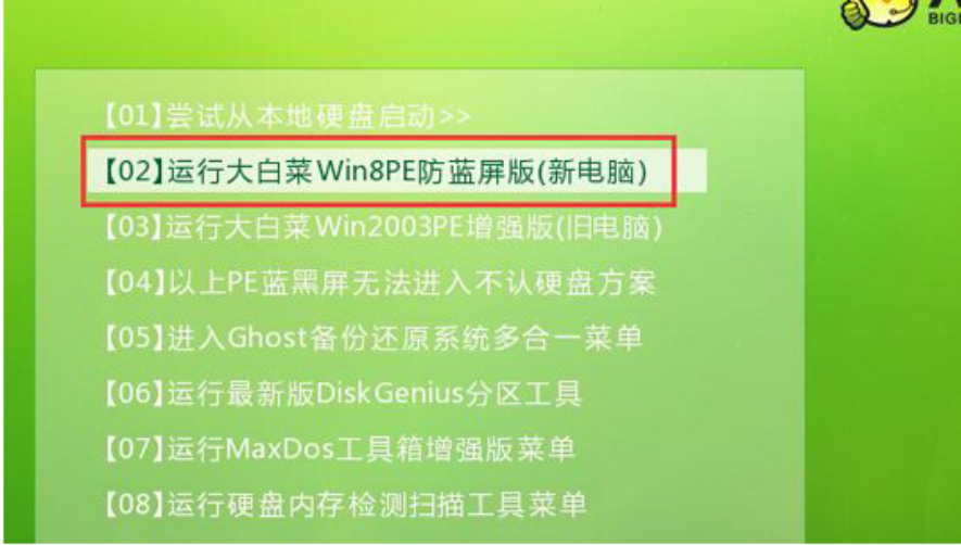 4.移動方向鍵選擇第二個大白菜win8pe系統。