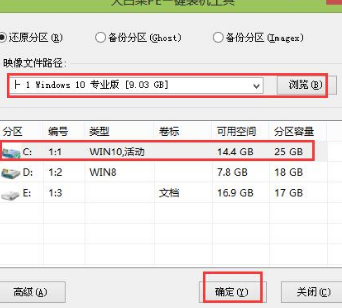 5.打開大白菜pe一鍵裝機工具,點擊“瀏覽”,將win10鏡像文件添加進來,選擇c盤為安裝盤,點擊確定。