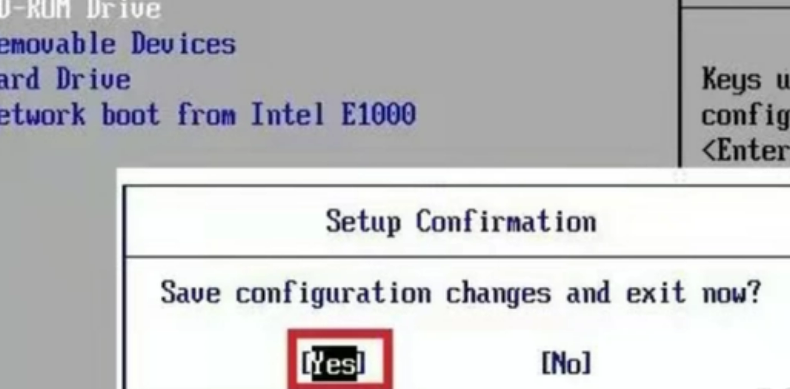 4.按F10保存設置,接著會彈出一個對話框,我們選擇“Yes"即可,然后電腦就開始自動重啟。