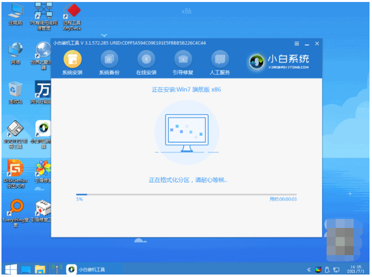 5、電腦在pe系統內,小白裝機工具將會自動開始安裝win7旗艦版系統,耐心等候。