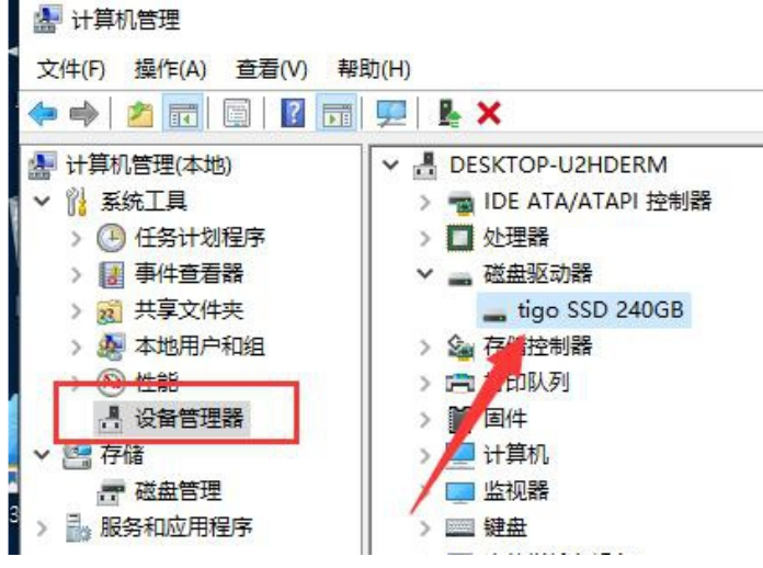 2、打開計算機管理后,點左側的設備管理器,查看磁盤驅動有沒有安裝,嘗試進行更新一下驅動。